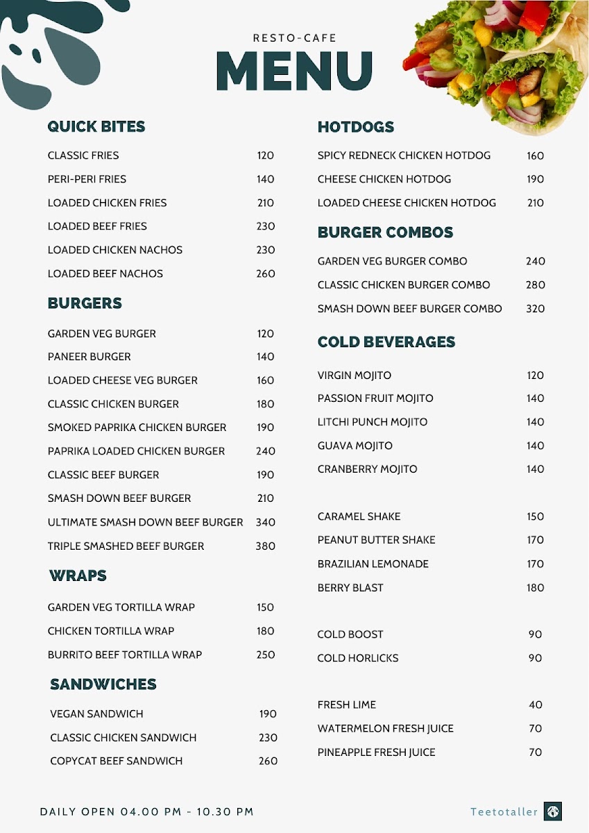 Welcome to Teetotaller Resto-Cafe, a hidden gem located on Sree Krishna Temple Rd in Chalakudy, Kerala. This cozy cafe offers a vibrant menu that caters to a variety of tastes, from quick bites to hearty mains. Highlights include their mouthwatering burgers, featuring options like the Ultimate Smash Down Beef Burger and Smoked Paprika Chicken Burger, both of which are sure to satisfy burger enthusiasts.